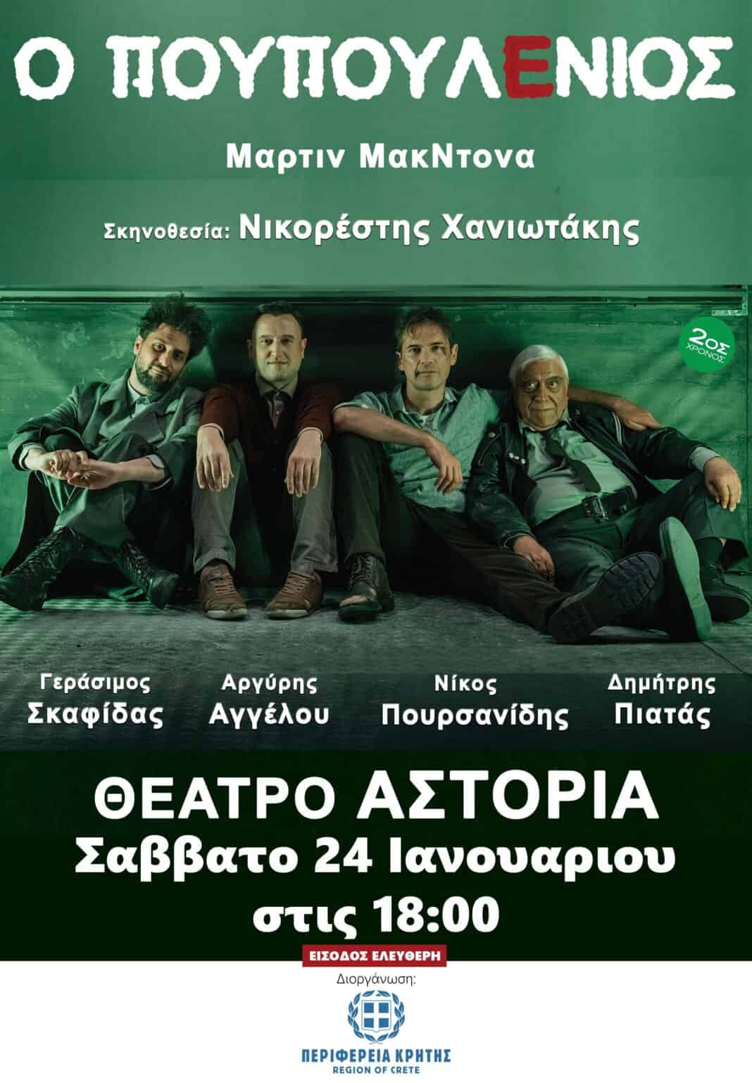 Η πολυβραβευμένη παράσταση «Ο Πουπουλένιος»  (The Pillowman) του Μάρτιν ΜακΝτόνα σε σκηνοθεσία Νικορέστη Χανιωτάκη, μετά από έναν χρόνο επιτυχημένων παραστάσεων στην Αθήνα, όπου κέρδισε το κοινό και απέσπασε διθυραμβικές κριτικές, παρουσιάζεται στο κινηματοθέατρο Αστόρια, στις 24 Ιανουαρίου 2026, στις 6:00 το απόγευμα, με την υποστήριξη της Περιφέρειας Κρήτης και ελεύθερη είσοδο για το κοινό.