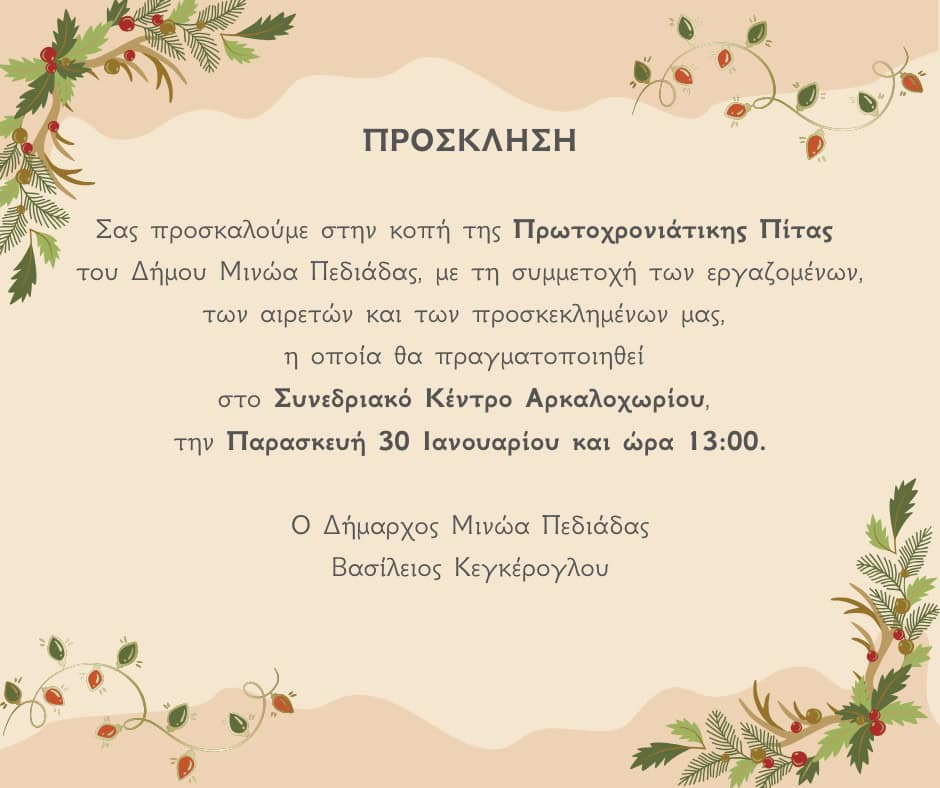 Ο Δήμος Μινώα Πεδιάδας πραγματοποιεί την κοπή της Πρωτοχρονιάτικης Πίτας, την Παρασκευή 30 Ιανουαρίου και ώρα 13:00, στο Συνεδριακό Κέντρο Αρκαλοχωρίου.