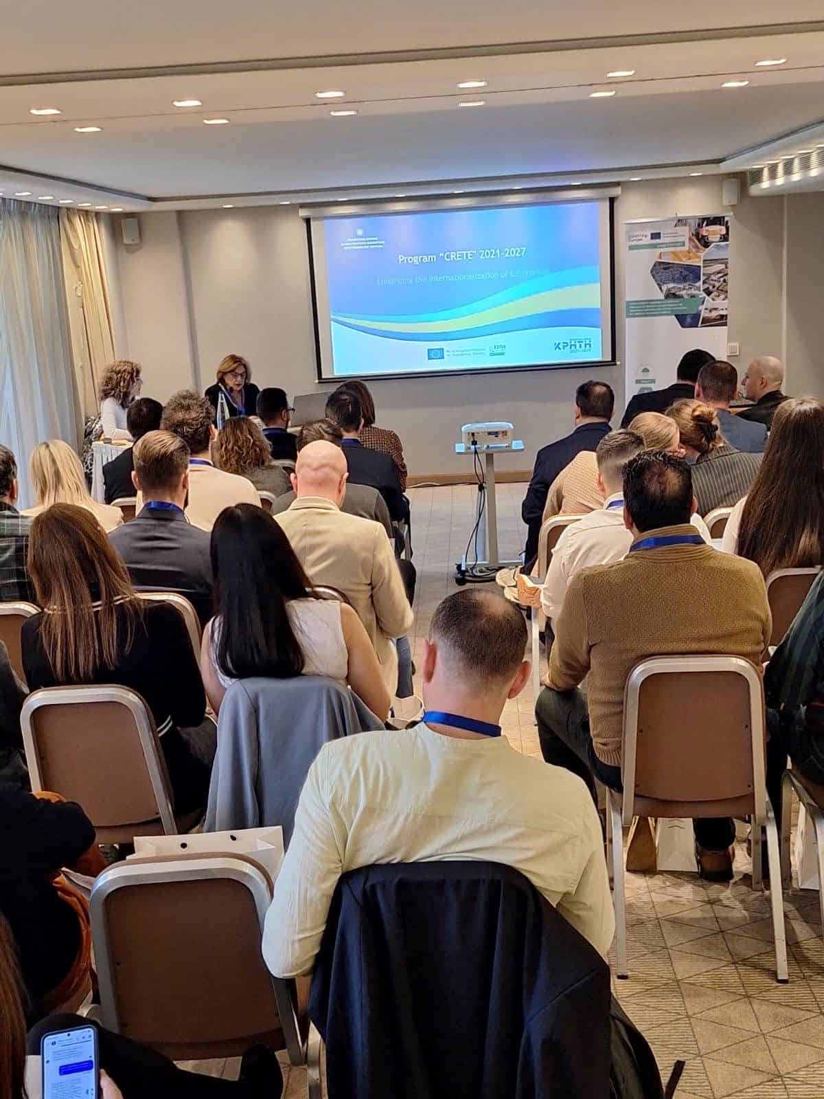 Στη συνέχεια, η Προϊσταμένη της Ειδικής Υπηρεσίας Διαχείρισης (ΕΥΔ) του Περιφερειακού Επιχειρησιακού Προγράμματος «Κρήτη», Μαρία Κασωτάκη, παρουσίασε το πλαίσιο υλοποίησης του Προγράμματος «Κρήτη 2021‑2027», εστιάζοντας στις δράσεις για την ενίσχυση της εξωστρέφειας των επιχειρήσεων.