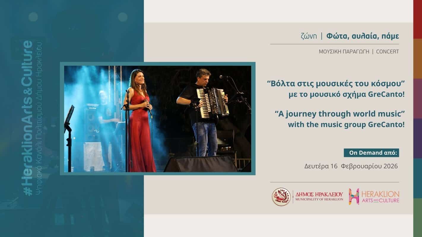 Η συναυλία «Βόλτα στις μουσικές του κόσμου» με το μουσικό σχήμα GreCanto που παρουσιάστηκε στο Φεστιβάλ «Τέχνη Καθ’ Οδόν» 2025 θα είναι από σήμερα διαθέσιμη στο ψηφιακό κανάλι πολιτισμού στο YouTube.  Η On line πρεμιέρα θα πραγματοποιηθεί την Δευτέρα 16 Δεκεμβρίου 2026 στις 20:00 στον παρακάτω σύνδεσμο  https://youtu.be/0sFdwgE3EbE  και έπειτα θα παραμείνει διαθέσιμη on demand για το κοινό.