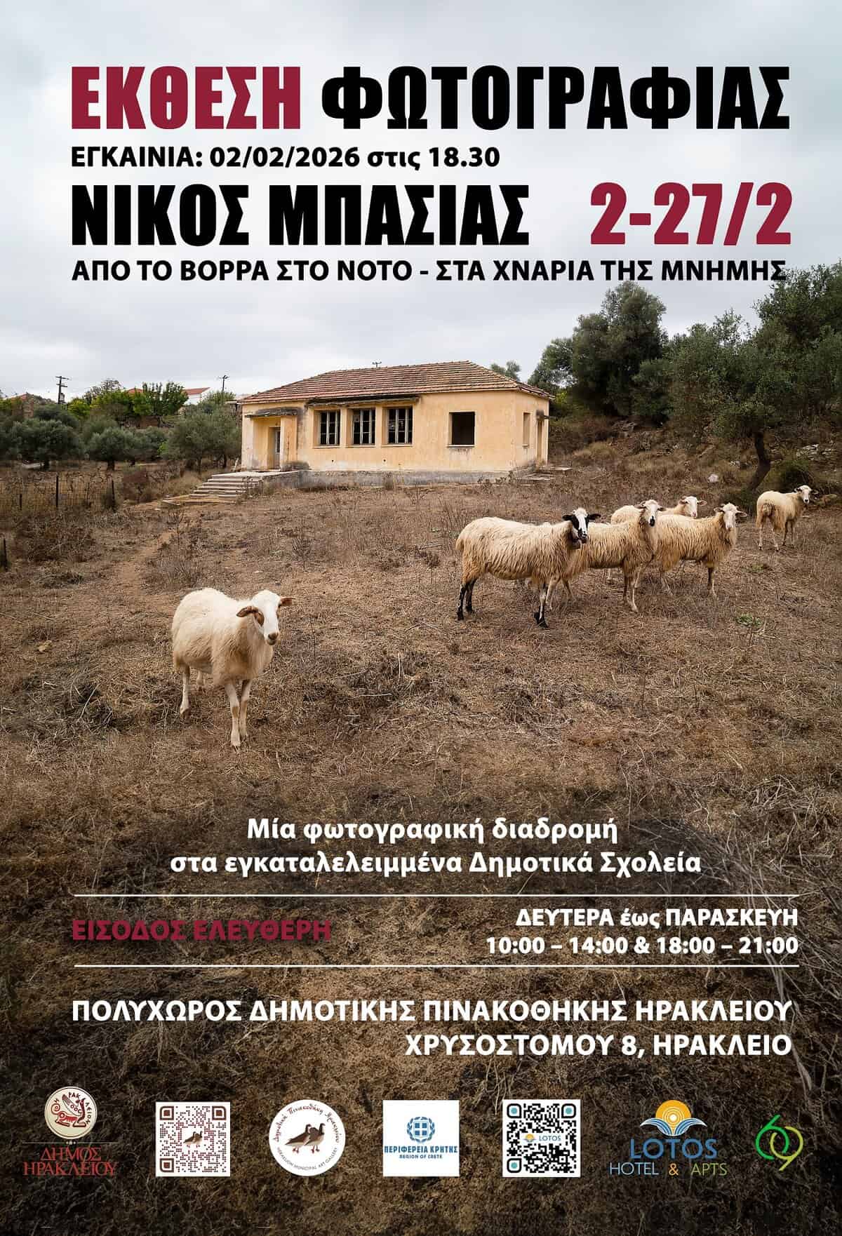 Ο Πολυχώρος – Γκαλερί της Δημοτικής Πινακοθήκης Ηρακλείου παρουσιάζει την ατομική έκθεση του βραβευμένου σε διεθνές και εθνικό επίπεδο φωτογράφου και εικαστικού Νίκου Μπασιά, ένα μοναδικό ταξίδι στον χώρο και τον χρόνο των δημοτικών σχολείων που σφράγισαν γενιές. Με τίτλο «Από τον Βορρά στον Νότο – Στα Χνάρια της Μνήμης», η έκθεση περιλαμβάνει φωτογραφίες από δημοτικά σχολεία σε όλη την Ελλάδα, την Κύπρο και τη Σμύρνη, χαρτογραφώντας την ιστορία και τη μνήμη μέσα από τα κτίρια που αποτέλεσαν κέντρα κοινότητας και εκπαίδευσης.