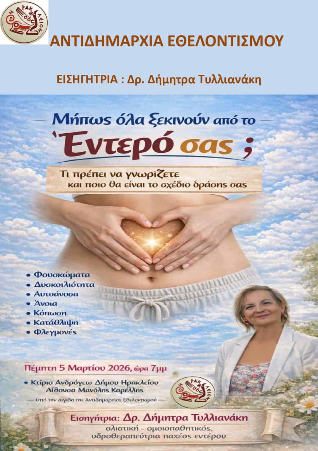 Ενημερωτική εκδήλωση με θέμα «Μήπως όλα ξεκινούν από το έντερό σας;» διοργανώνει η Αντιδημαρχία Εθελοντισμού του Δήμου Ηρακλείου την Πέμπτη 5 Μαρτίου στις 19:00 στην αίθουσα «Μανόλης Καρέλλης» στο δημοτικό κτίριο της Ανδρόγεω.