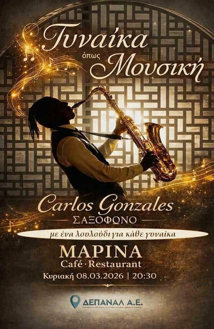Μια βραδιά γεμάτη μελωδίες σαξοφώνου με τον υπέροχο Carlos Gonzalez, θα πραγματοποιηθεί την Κυριακή 8 Μαρτίου, στις 20:30 στο Marina Café Restaurant.