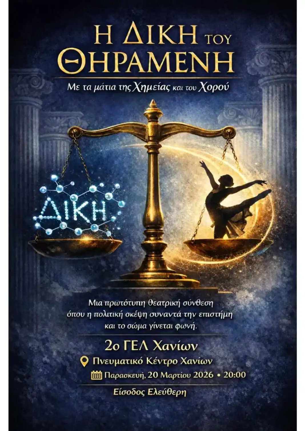 Το 2ο Γενικό Λύκειο Χανίων παρουσιάζει τη θεατρική παράσταση «Η Δίκη του Θηραμένη με τα μάτια της Χημείας και του Χορού», μια δράση των εκπαιδευτικών και των μαθητών του Λυκείου, την Παρασκευή 20 Μαρτίου 2026, ώρα 20.00, στο Πνευματικό Κέντρο Χανίων.