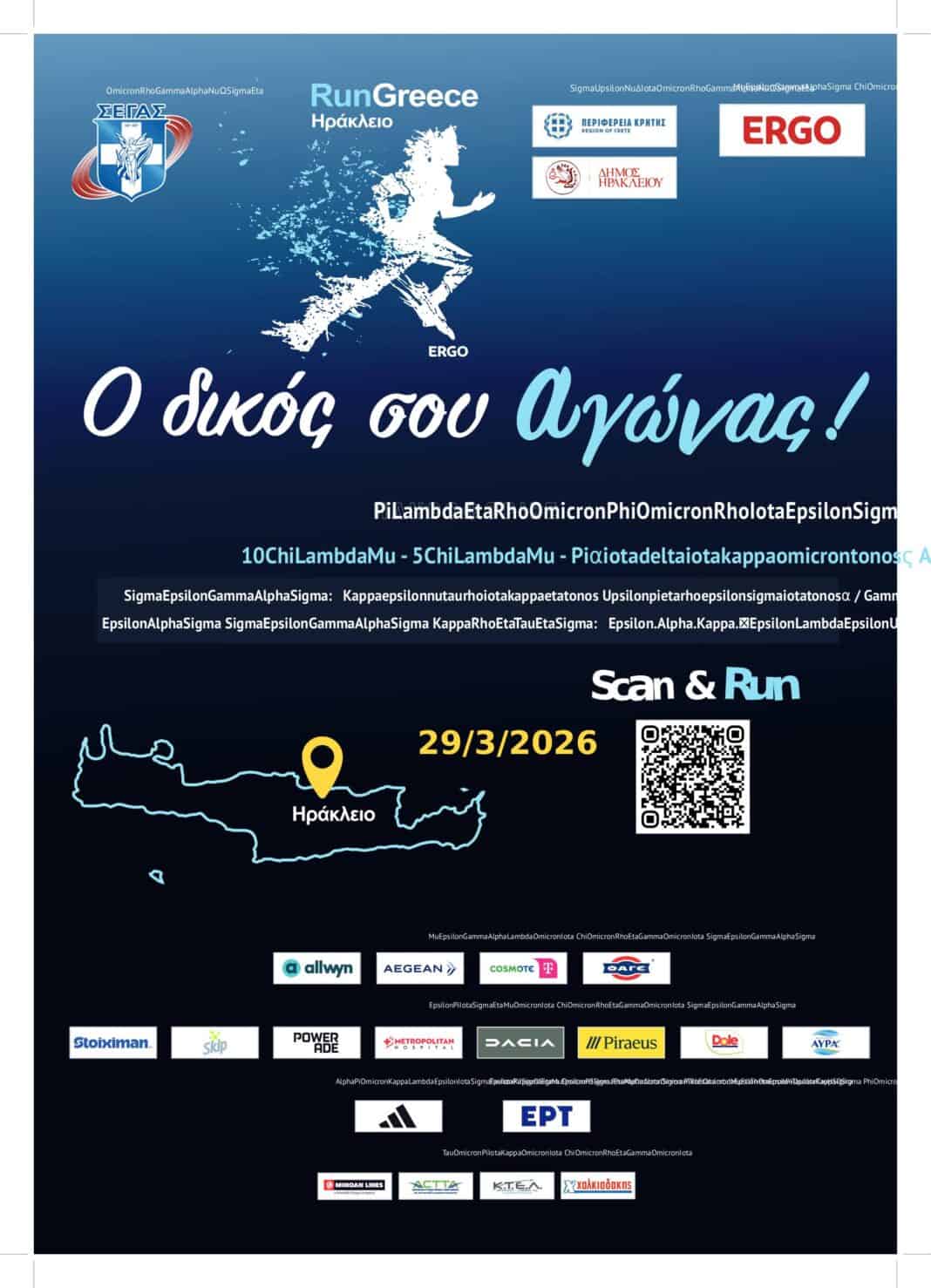 Σ.Ε.Γ.Α.Σ.  και η Ε.Α.Σ. Σ.Ε.ΓΑ.Σ. Κρήτης με συνδιοργανωτές την ΠΕΡΙΦΕΡΕΙΑ ΚΡΗΤΗΣ και τον ΔΗΜΟ ΗΡΑΚΛΕΙΟΥ, μεγάλο χορηγό την ERGO Ασφαλιστική  και τοπικούς  χορηγούς τις Μινωικές Γραμμές,  το Σύνδεσμο Τουριστικών και Ταξιδιωτικών Γραφείων Κρήτης, το Κ.Τ.Ε.Λ. Ηρακλείου – Λασιθίου Α.Ε. και τα Super Market  Χαλκιαδάκης, διοργανώνουν για 13η χρονιά τον αγώνα δρόμου και βαδίσματος RUN GREECE ΗΡΑΚΛΕΙΟ, την Κυριακή 29 Μαρτίου, με εκκίνηση και τερματισμό στην Πλατεία Ελευθερίας.