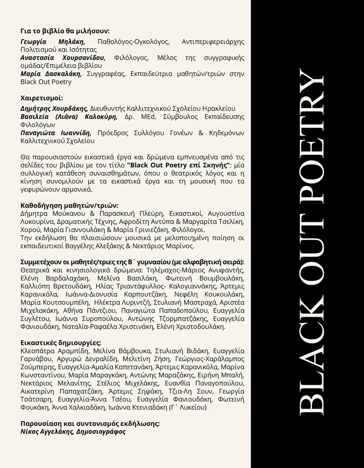 Για το βιβλίο θα μιλήσουν η Γεωργία Μηλάκη, Αντιπεριφερειάρχης Πολιτισμού και Ισότητας της Περιφέρειας Κρήτης, η Αναστασία Χουρσανίδου, Φιλόλογος, μέλος της συγγραφικής ομάδας και υπεύθυνη επιμέλειας του βιβλίου και η Μαρία Δασκαλάκη, συγγραφέας και εκπαιδεύτρια μαθητών/τριών στο Black Out Poetry. Χαιρετισμό θα απευθύνουν ο Δημήτρης Χουρδάκης, Διευθυντής του Καλλιτεχνικού Σχολείου Ηρακλείου, η Βασιλεία (Λιάνα) Καλοκύρη, Δρ. Med, Σύμβουλος Εκπαίδευσης Φιλολόγων και η Παναγιώτα Ιωαννίδη, Πρόεδρος του Συλλόγου Γονέων & Κηδεμόνων του Καλλιτεχνικού Σχολείου.