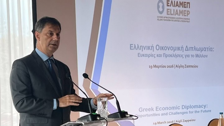 Το Ελληνικό Ίδρυμα Ευρωπαϊκής και Εξωτερικής Πολιτικής (ΕΛΙΑΜΕΠ) διοργάνωσε χθες, Πέμπτη 19/3/26, στην Αίγλη Ζαππείου, εκδήλωση με θέμα «Ελληνική Οικονομική Διπλωματία: ευκαιρίες και προκλήσεις για το μέλλον», με αφορμή τη δημοσίευση σχετικού κειμένου πολιτικής.