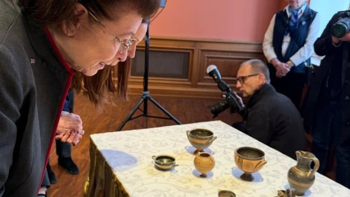 Η υπουργός Λίνα Μενδώνη σημείωσε ότι «παραμένει ενεργή η διαδικασία της διεκδίκησης από την Ελλάδα δεκατριών ακόμη, αρχαιοτήτων που φαίνεται να προέρχονται από το ίδιο σύνολο. Η προστασία της πολιτιστικής κληρονομιάς δεν είναι πεδίο αντιπαράθεσης. Είναι πεδίο συνεργασίας. Είναι κοινή ευθύνη των λαών να την προστατεύουν και να την παραδίδουν στις επόμενες γενιές με βάση τις αρχές της βιώσιμης ανάπτυξης. Σε λίγους μήνες, στο τέλος Ιουνίου, το υπουργείο Πολιτισμού ολοκληρώνει το έργο της πλήρους ανακαίνισης του Αρχαιολογικού Μουσείου του Άργους, με την επέκτασή του και την επανέκθεσή του, και το αποδίδει στους πολίτες και τους επισκέπτες της Αργολίδας. Εκεί θα βρουν την οριστική τους θέση τα εννέα αγγεία με καταγεγραμμένη την περιπέτειά τους, αναμένοντας και τ’ αδέλφια τους».