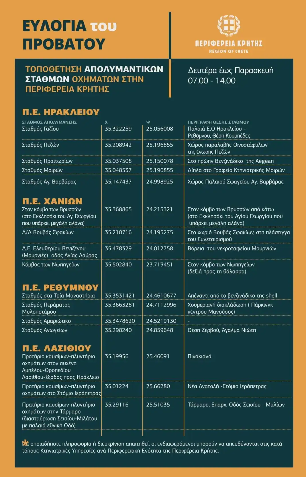 Σημειώνεται ότι πραγματοποιήθηκε αλλαγή στη θέση ενός απολυμαντικού σταθμού στην Περιφερειακή Ενότητα Χανίων.