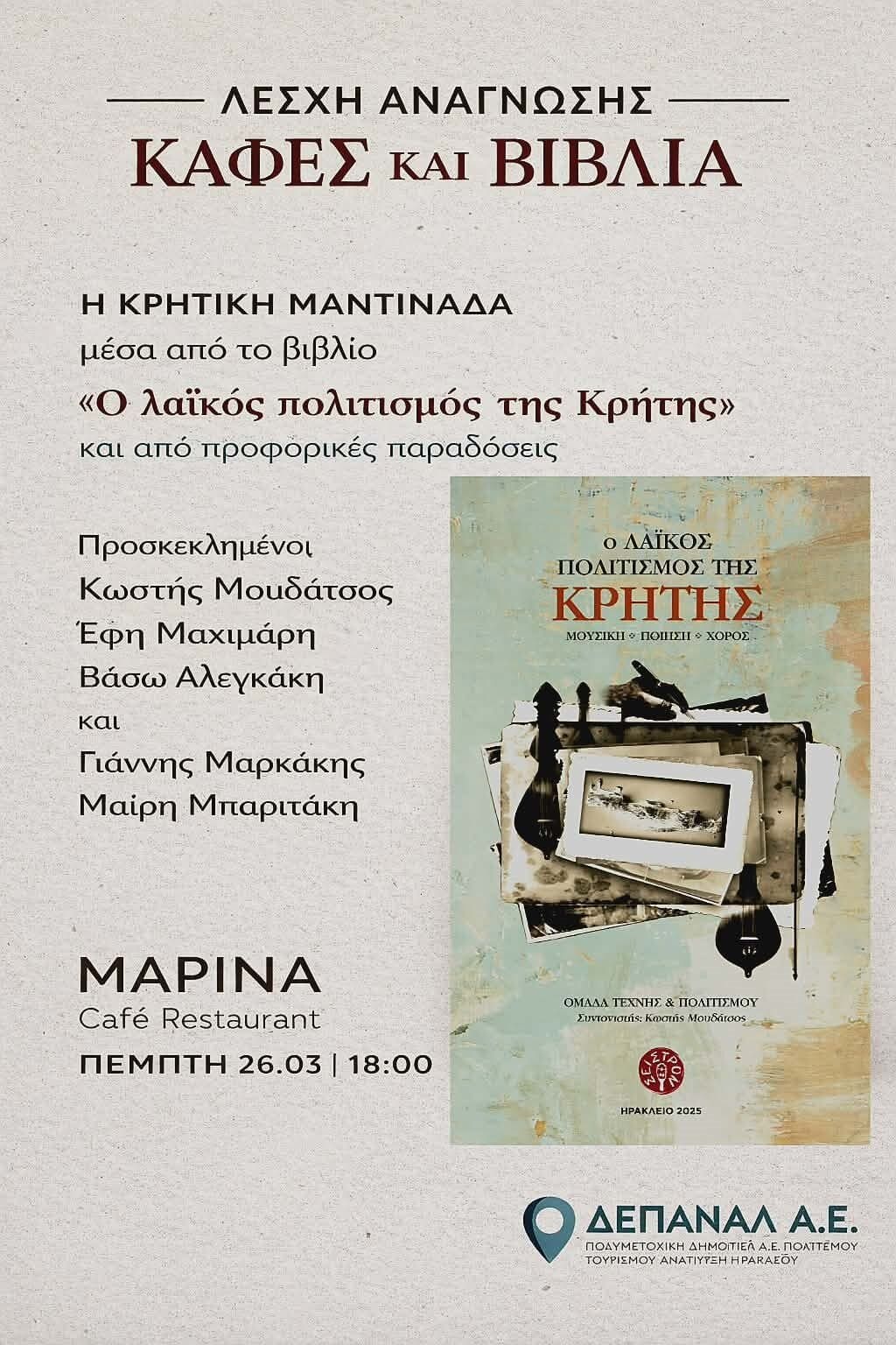 Με αφιέρωμα στην κρητική μαντινάδα, την πιο αυθεντική μορφή λαϊκής ποίησης, με αφορμή και την πρόσφατη Παγκόσμια Ημέρα Ποίησης, συνεχίζει η Λέσχη Ανάγνωσης «Καφές και Βιβλία», στο ΜΑΡΙΝΑ Café Restaurant.