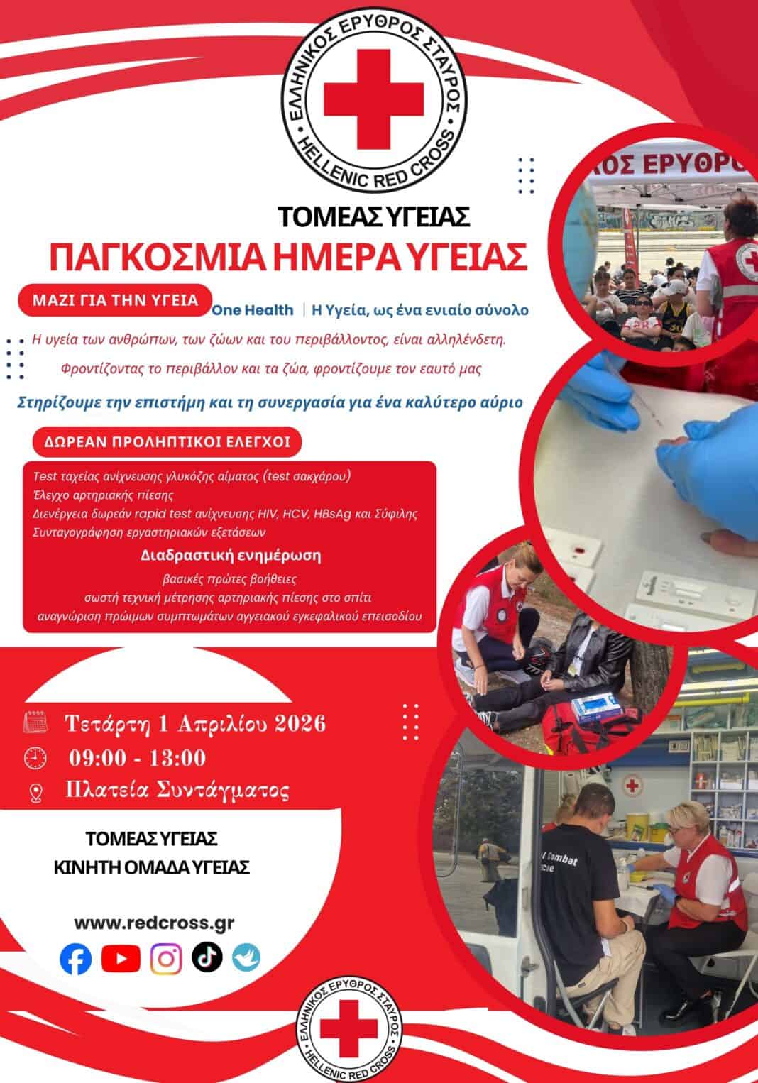 Ο Ελληνικός Ερυθρός Σταυρός (ΕΕΣ), με αφορμή την Παγκόσμια Ημέρα Υγείας, διοργανώνει δράση ενημέρωσης και πρόληψης, την Τετάρτη 1 Απριλίου 2026, από τις 09:00 έως τις 13:00, στην Πλατεία Συντάγματος, καλώντας το κοινό να γίνει ενεργό μέρος στη φροντίδα και την προαγωγή της υγείας.