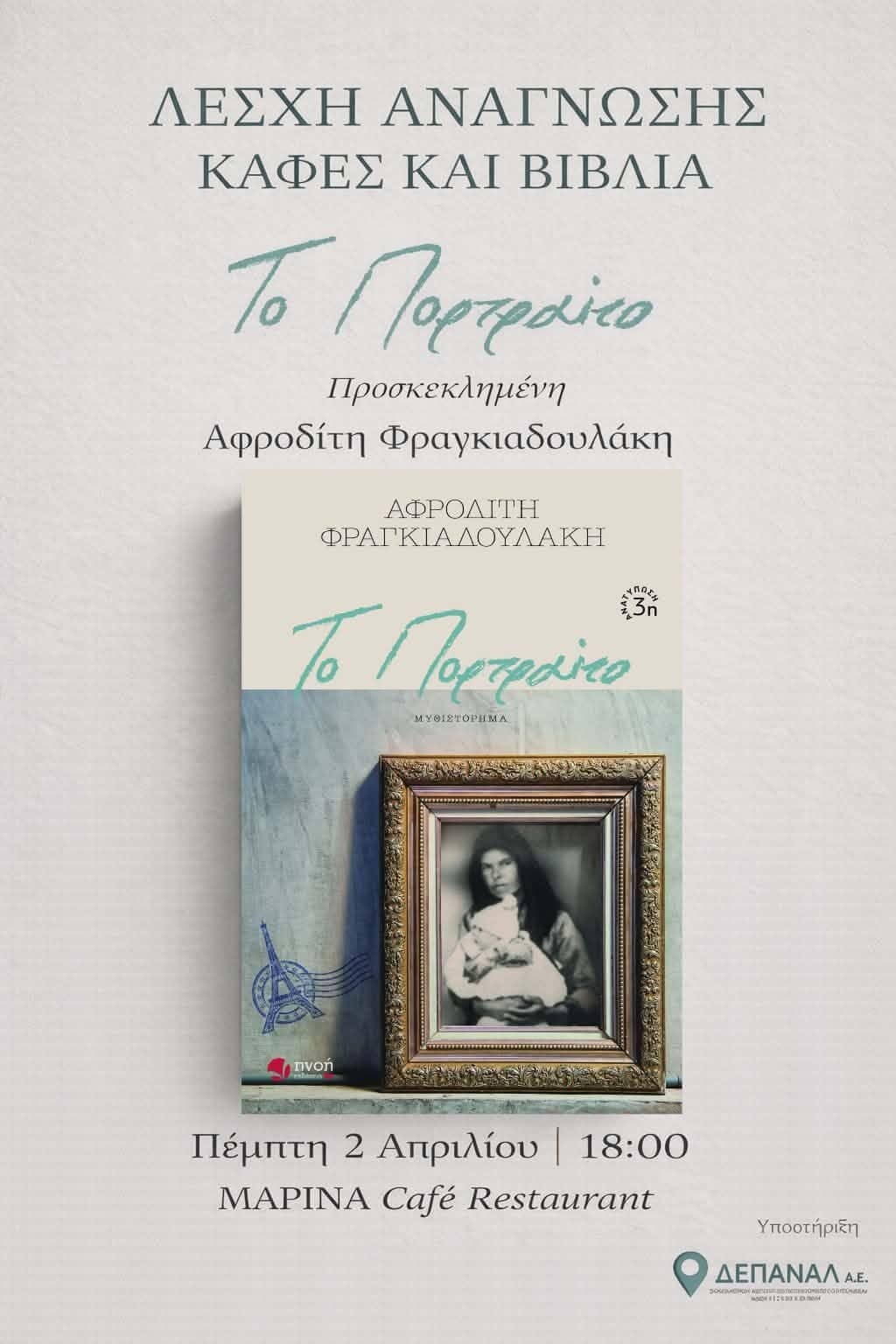 Την Πέμπτη 2 Απριλίου θα γίνει μία ακόμα συνάντηση στις 18:00 το απόγευμα «συντροφιά» με το μυθιστόρημα της Αφροδίτης Φραγκιαδουλάκη «Το Πορτραίτο». Ένα μυθιστόρημα γεμάτο ιστορίες από εκείνες τις μισοξεχασμένες, που έλεγαν οι παππούδες και οι γιαγιάδες… «Το Πορτραίτο» της Αφροδίτης Φραγκιαδουλάκη από τις εκδόσεις «Πνοή» είναι ένα βιβλίο – ποταμός για τις μνήμες, τον πόλεμο, τον ξεριζωμό και τον μεγαλύτερο έρωτα, τον έρωτα για την πατρίδα. Ένα βιβλίο που ξεκινάει και συνεχώς επιστρέφει στην Κρήτη.