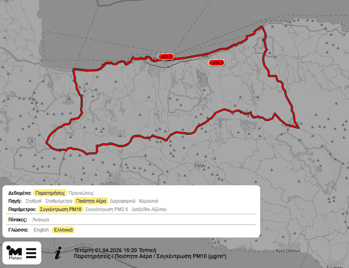 Οι συγκεντρώσεις αιωρούμενων σωματιδίων είναι εξαιρετικά υψηλές στην Κρήτη την Τετάρτη 01/04/2026. Οι σταθμοί ποιότητας αέρα που λειτουργούν από το Meteo.gr/Εθνικό Αστεροσκοπείο Αθηνών στο Δημαρχείο Ρεθύμνου και στο Αδελε (ως μέρος του Ολοκληρωμένου Συστήματος Παρακολούθησης Καιρικών Συνθηκών Ρεθύμνου) κατέγραψαν το μεσημέρι της Τετάρτης 01/04 συγκεντρώσεις που προσέγγισαν τα 1000 μικρογραμμάρια/κυβικό μέτρο (βλ. χάρτη παρακάτω).