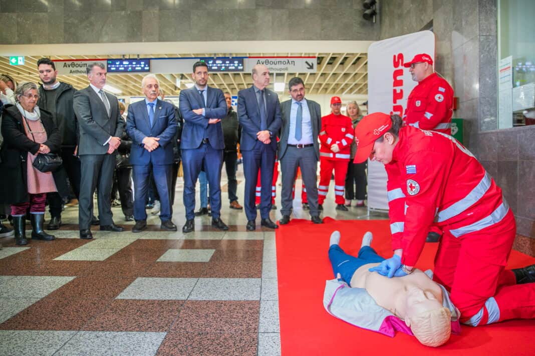 Ο Ελληνικός Ερυθρός Σταυρός, την Πέμπτη 2 Απριλίου 2026, στο Μετρό Συντάγματος, με εθελοντές Σαμαρείτες – Διασώστες, παρουσίασε την χρήση Αυτόματου Εξωτερικού Απινιδωτή (AED) στο κοινό, παρουσία του Αναπληρωτή Υπουργού Μεταφορών, κ. Κωνσταντίνου Κυρανάκη, του Προέδρου του Ε.Ε.Σ. Dr. Αντώνιου Αυγερινού, του Διευθύνοντα Σύμβουλου του ΟΑΣΑ και Πρόεδρο Δ.Σ. ΣΤΑ.ΣΥ κ. Αντώνη Κεραστάρη, και του Διευθύνοντα Σύμβουλου της ΣΤΑ.ΣΥ κ. Αθανάσιο Κοτταρά. Η παρουσίαση πραγματοποιήθηκε στο πλαίσιο της τοποθέτησης αυτόματων εξωτερικών Απινιδωτών (AED) και στους 66 σταθμούς των Τριών Γραμμών του Μετρό της Αθήνας, χορηγία της εταιρείας Διαμαντής Μασούτης Α.Ε.