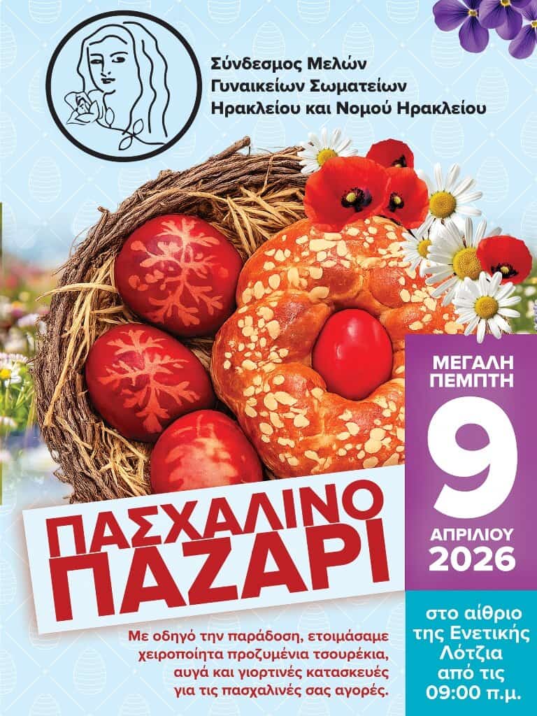 Το Πάσχα της πόλης μας έχει σημείο συνάντησης! Το καθιερωμένο φιλανθρωπικό Πασχαλινό Παζάρι του «Συνδέσμου Μελών Γυναικείων Σωματείων Ηρακλείου και Ν. Ηρακλείου», σήμερα Μεγάλη Πέμπτη 9 Απριλίου 2026, από τις 9π.μ. στον γνώριμο χώρο του Αιθρίου της Λότζια, που θα γεμίσει χρώματα, αρώματα κι ανθρώπους που επιλέγουν να γιορτάσουν αλλιώς: Με προσφορά.
