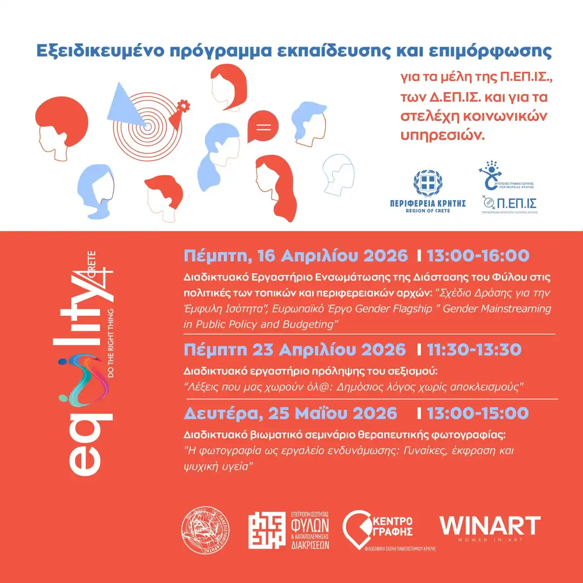 Με ιδιαίτερη επιτυχία συνεχίζεται το εξειδικευμένο πρόγραμμα εκπαίδευσης και επιμόρφωσης που υλοποιεί η Περιφέρεια Κρήτης για τα μέλη της Περιφερειακής Επιτροπής Ισότητας (Π.ΕΠ.ΙΣ.), των Δημοτικών Επιτροπών Ισότητας (Δ.ΕΠ.ΙΣ.) Κρήτης, καθώς και για τα στελέχη κοινωνικών υπηρεσιών και φορέων της Κοινωνίας των Πολιτών.