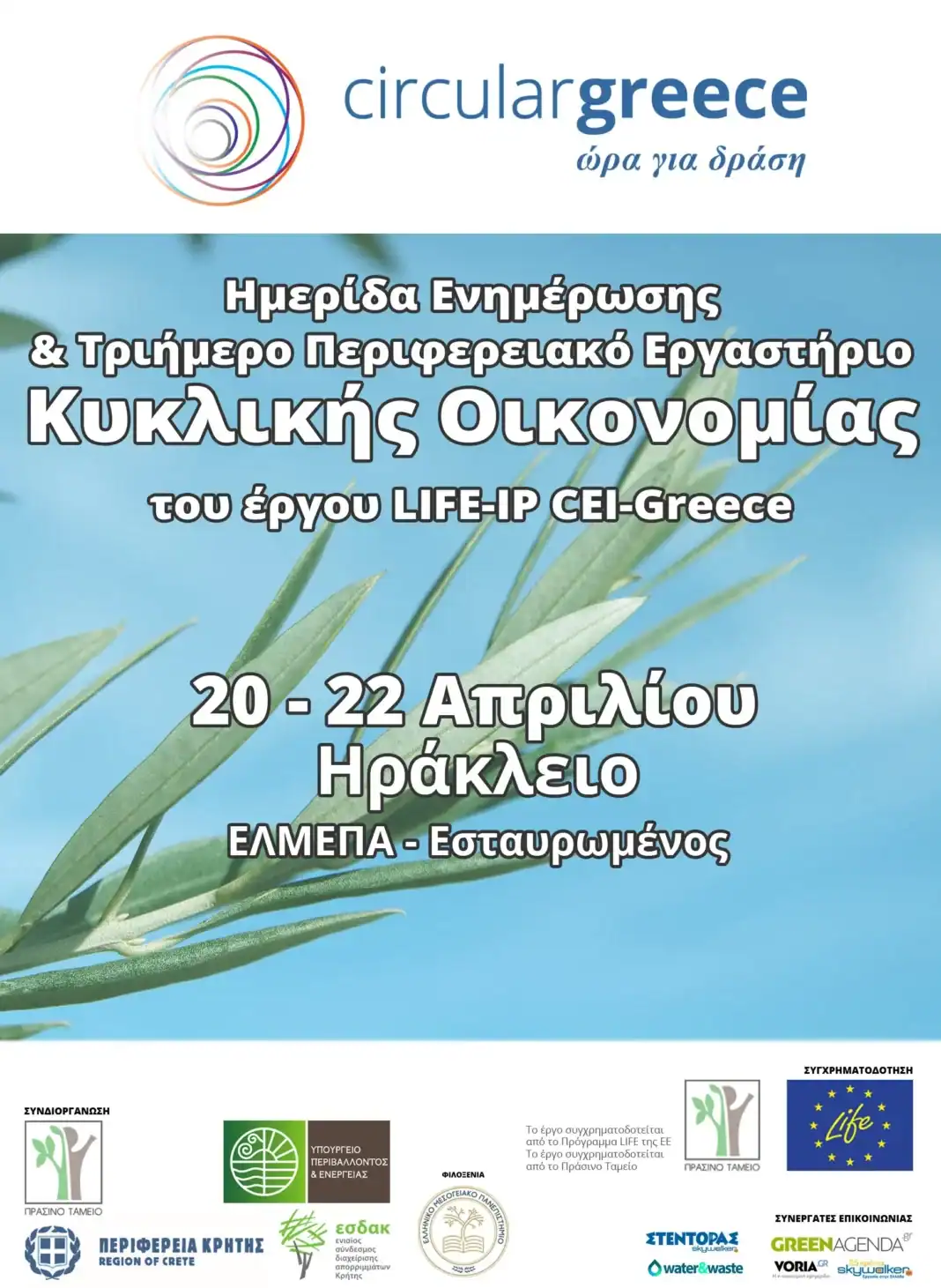 Ημερίδα Ενημέρωσης και Περιφερειακό Εργαστήριο Κυκλικής Οικονομίας στην Κρήτη συνδιοργανώνουν το Πράσινο Ταμείο, το Υπουργείο Περιβάλλοντος και Ενέργειας (ΥΠΕΝ), η Περιφέρεια Κρήτης και ο Ενιαίος Σύνδεσμος Διαχείρισης Απορριμμάτων Κρήτης (ΕΣΔΑΚ) από τις 20 έως και τις 22 Απριλίου 2026, στο Ηράκλειο και συγκεκριμένα στο Ελληνικό Μεσογειακό Πανεπιστήμιο (Περιοχή Εσταυρωμένος), στο πλαίσιο του Έργου LIFE-IP CEI-Greece – LIFE18 IPE/GR/000013 «Εφαρμογή της Κυκλικής Οικονομίας στην Ελλάδα».