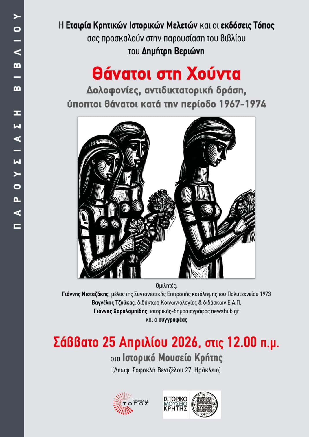 Η Εταιρία Κρητικών Ιστορικών Μελετών διοργανώνει το Σάββατο 25 Απριλίου 2026, ώρα 12:00΄ στο Αμφιθέατρο Γιάννη Περτσελάκη του Ιστορικού Μουσείου Κρήτης (Λεωφ. Σοφοκλή Βενιζέλου 27, Ηράκλειο) παρουσίαση του βιβλίου του Δημήτρη Βεριώνη, Θάνατοι στη Χούντα. Δολοφονίες, αντιδικτατορική δράση, ύποπτοι θάνατοι κατά την περίοδο 1967-1974, Εκδόσεις Τόπος, Αθήνα 2024.
