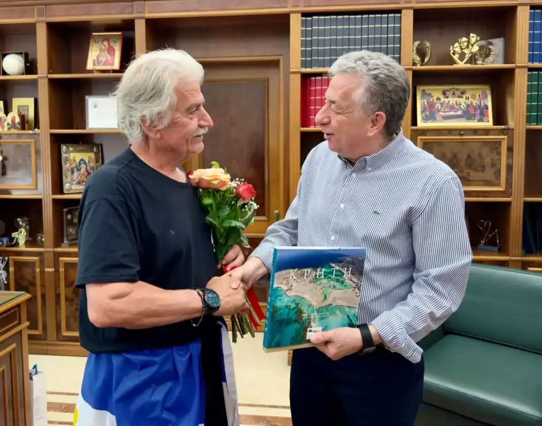 Τον αθλητή υπεραποστάσεων Θεοχάρη Αθητάκη υποδέχθηκε χθες στο κτίριο της Περιφέρειας ο Περιφερειάρχης Κρήτης Σταύρος Αρναουτάκης, με αφορμή την ολοκλήρωση της ιστορικής διαδρομής 153 χιλιομέτρων που πραγματοποίησε ο αθλητής από την Ανώπολη Σφακίων προς το Ηράκλειο.