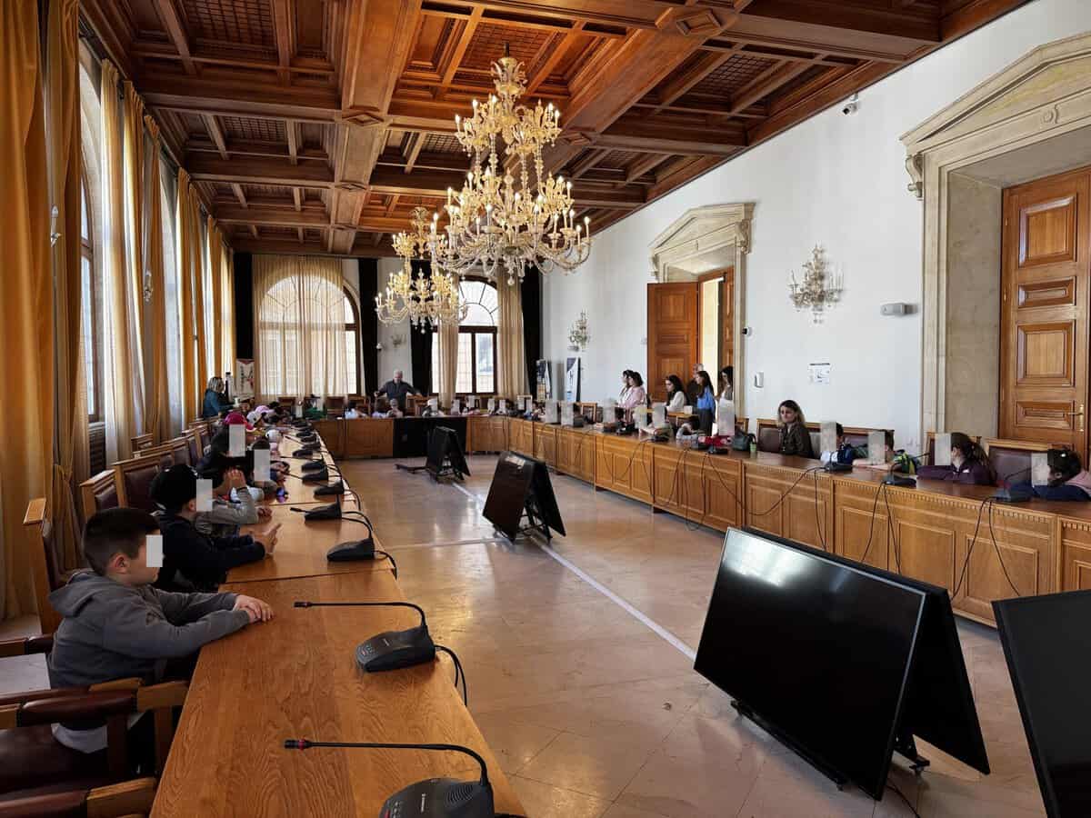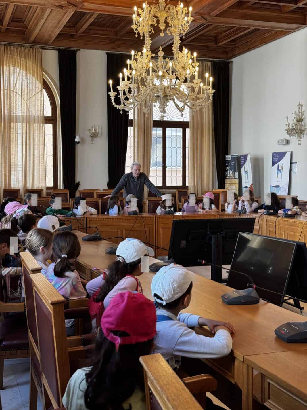 Στο πλαίσιο του εκπαιδευτικού τους περιπάτου, τα παιδιά επισκέφθηκαν τη Λότζια και ο Αλέξης Καλοκαιρινός, αφήνοντας για λίγο το πρόγραμμα του, τα καλωσόρισε στην αίθουσα του Δημοτικού Συμβουλίου «Ελευθέριος Βενιζέλος».