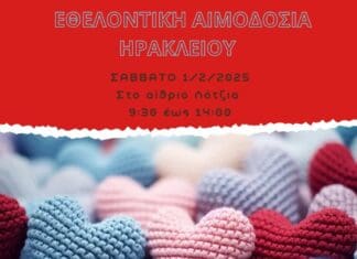 Το Σάββατο 1 Φεβρουαρίου 2025 θα πραγματοποιηθεί εθελοντική αιμοδοσία στο κέντρο της πόλης του Ηρακλείου και συγκεκριμένα στο αίθριο της Λότζια από τις 09:30...