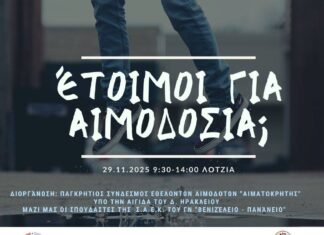 Σήμερα Σάββατο 29 Νοεμβρίου 2025 θα πραγματοποιηθεί εθελοντική αιμοδοσία στο κέντρο της πόλης του Ηρακλείου και συγκεκριμένα στο αίθριο της Λότζια από τις 09:30...