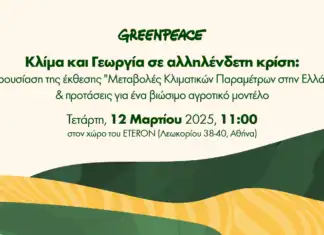 Η Greenpeace παρουσίασε την Τετάρτη 12-3-2025, τη νέα επιστημονική Έκθεση “Μεταβολές κλιματικών παραμέτρων στην Ελλάδα” στα πλαίσια ενημερωτικής εκδήλωσης με τίτλο “Κλίμα και Γεωργία σε αλληλένδετη...